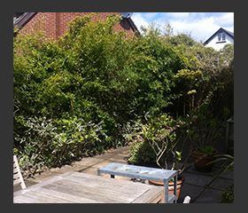 With the design of the back garden we had to bring a digger in through a neighbouring car park in order to dig out the bamboo by the roots. Trellis panels were spray painted off site and bespoke planters constructed for Bay trees and Lillies. Exterior flower beds have all been planted too.